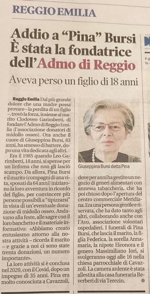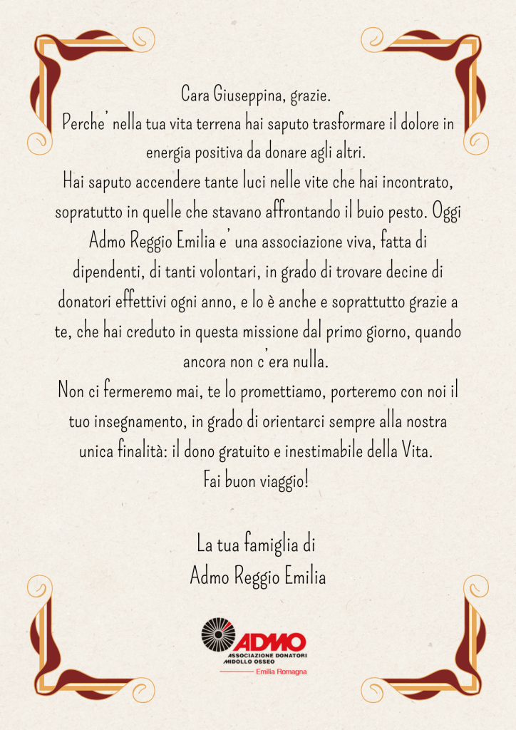 Giuseppina, insieme al marito Clodoveo, è stata la fondatrice di ADMO Reggio Emilia. “Pina” era una donna forte, riservata ma determinata, ha saputo reagire all’immensa perdita del figlio “Leo” che, a causa di un Linfoma, è venuto a mancare a soli 18 anni, mettendo le basi per quella che è oggi ADMO.