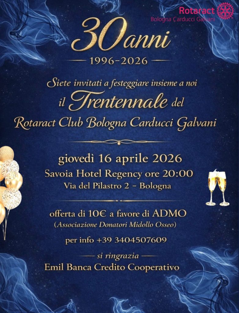 2026 segna un traguardo storico per uno dei club più attivi del territorio: il Rotaract Club Bologna Carducci Galvani compie 30 anni. Un anniversario importante (1996-2026) che il Club ha deciso di celebrare mettendo al centro, ancora una volta, il dono e la speranza.