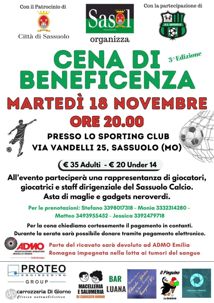 Torna la cena neroverde per ADMO, la Cena di Beneficenza Sasol giunta alla sua 3ª Edizione.
