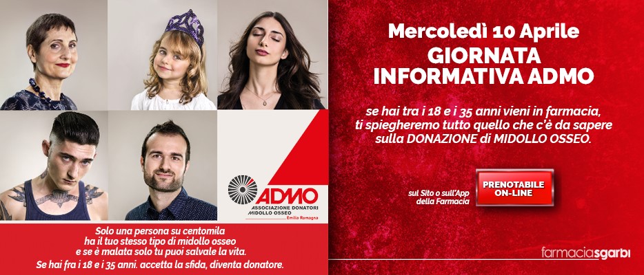 A seguire Mercoledì 10 aprile, presso la Farmacia Sgarbi di Molinella si terrà una GIORNATA INFORMATIVA ADMO e la possibilità per tutte le persone tra i 18 e i 35 anni interessante a diventare potenziali donatori di midollo osseo compiere questo bellissimo gesto ed iscriversi.