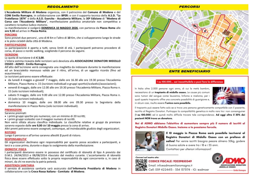 Domenica 10 maggio 2026, le strade di Modena si tingeranno di solidarietà. Anche quest’anno, l’Accademia Militare ha scelto di scendere in campo al fianco di ADMO Emilia Romagna, confermando un legame profondo e duraturo. L’intero ricavato delle iscrizioni sarà infatti devoluto alla nostra Fondazione per sostenere le attività di sensibilizzazione e la ricerca di nuovi donatori di midollo osseo.