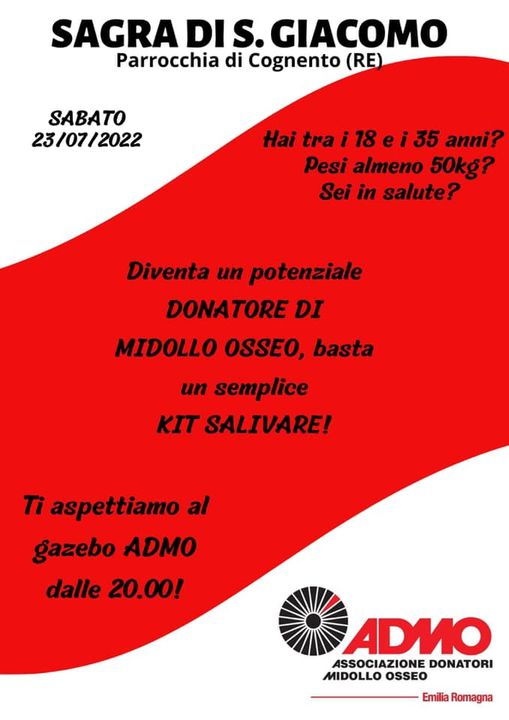 sabato 23/07 – Campagnola Emilia – ore 20 Un’altra splendida occasione per fare la differenza ed entrare del Registro Donatori Midollo Osseo… se hai tra